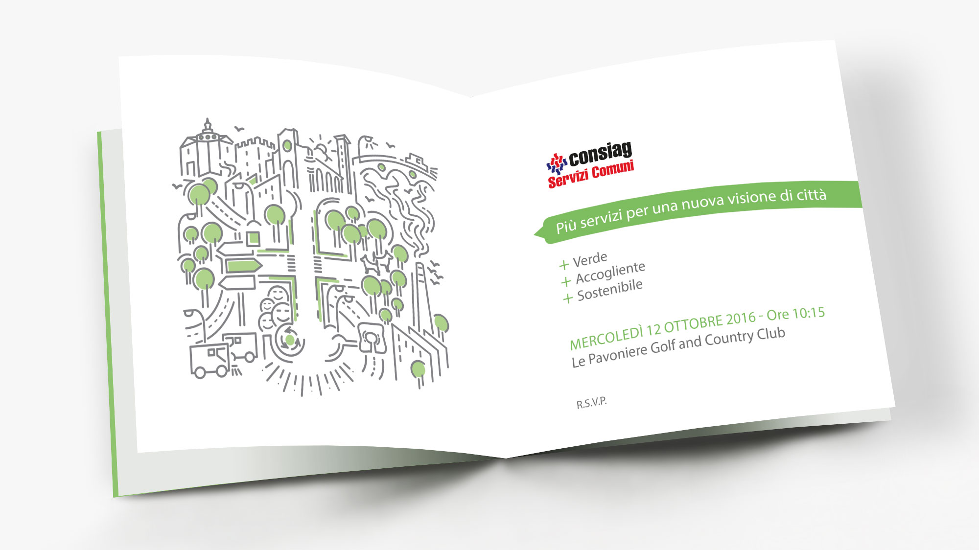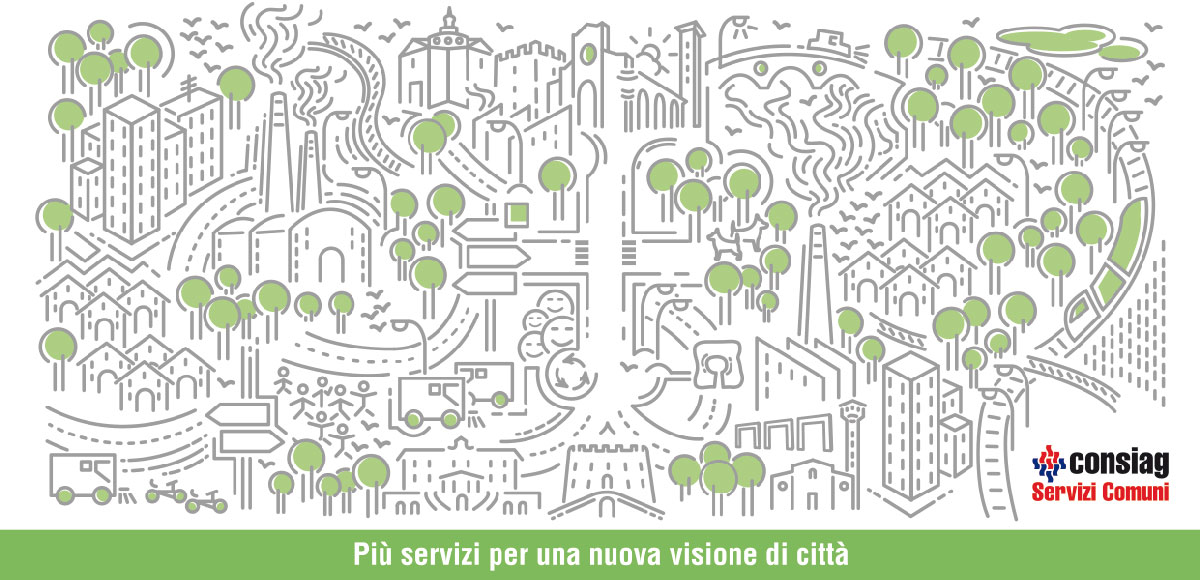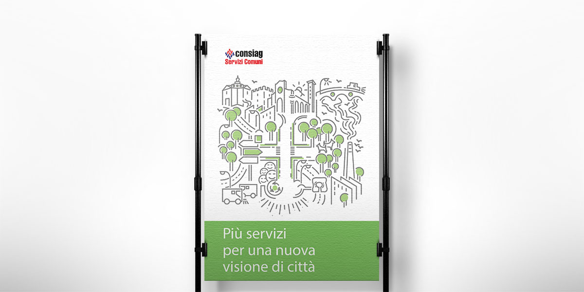Creazione concept grafico per evento di presentazione dei nuovi servizi di Consiag Servizi Comuni. Una realtà in continua evoluzione per i servizi al cittadino. Il tema del concept è una città stilizzata nella quale si scorgono alcuni elementi architettonici dei comuni dove Consiag effettua i propri servizi.